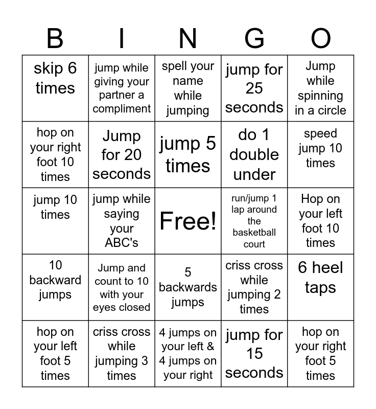 This bingo card has a free space and 24 words: Jump and count to 10 with your eyes closed, criss cross while jumping 3 times, jump 5 times, hop on your left foot 5 times, Jump while spinning in a circle, skip 6 times, hop on your right foot 10 times, jump while giving your partner a compliment, run/jump 1 lap around the basketball court, 5 backwards jumps, do 1 double under, jump 10 times, criss cross while jumping 2 times, 6 heel taps, Jump for 20 seconds, jump for 15 seconds, Hop on your left foot 10 times, spell your name while jumping, speed jump 10 times, jump while saying your ABC's, hop on your right foot 5 times, 10 backward jumps, jump for 25 seconds and 4 jumps on your left & 4 jumps on your right.