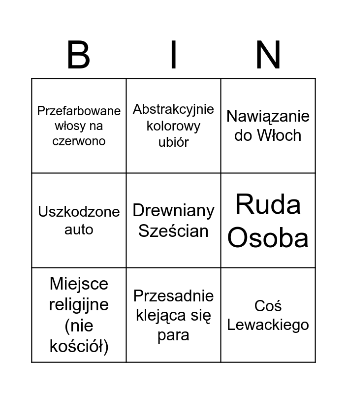 This bingo card has a free space and 8 words: Ruda Osoba, Nawiązanie do Włoch, Abstrakcyjnie kolorowy ubiór, Miejsce religijne (nie kościół), Przefarbowane włosy na czerwono, Coś Lewackiego, Uszkodzone auto and Przesadnie klejąca się para.