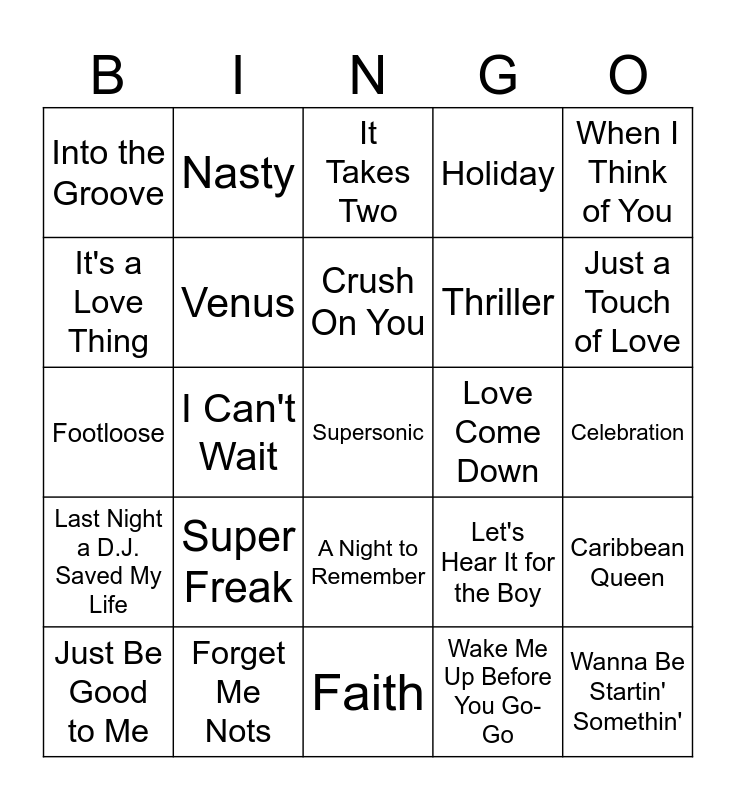 This bingo card has 89 words: Free!, Pump Up the Jam, A Night to Remember, Addicted to Love, All Night Long, All Night Long, Automatic, Back to Life, Bizarre Love Triangle, Borderline, Buffalo Stance, Can You Feel It, Caribbean Queen, Celebration, Conga, Crush On You, Dance Hall Days, Don't Go, Don't You Want Me, Don't You Want Me, Every Little Step, Everybody Everybody, Faith, Flashdance, Footloose, Forget Me Nots, Genius of Love, Girl You Know It's True, Girls Just Want to Have Fun, Head to Toe, Holiday, I Can't Wait, I Feel for You, Into the Groove, It Takes Two, It Takes Two, It's a Love Thing, Jessie's Girl, Just a Touch of Love, Just Be Good to Me, Last Night a D.J. Saved My Life, Let the Music Play, Let's Dance, Let's Groove, Let's Hear It for the Boy, Love Come Down, Love Shack, Mama Used to Say, Midas Touch, Nasty, Never Gonna Give You Up, Never Too Much, New Sensation, Obsession, Oh Sheila, Party All the Time, Planet Rock, Pump Up the Volume, Rapture, Raspberry Beret, Relax, Rhythm of the Night, Rock the Casbah, Rockit, She Works Hard For the Money, Square Biz, Start Me Up, Straight Up, Super Freak, Super Freak, Supersonic, Sussudio, Tainted Love, Thriller, Venus, Wake Me Up Before You Go-Go, Walk Like an Egyptian, Walk This Way, Walking On Sunshine, Wanna Be Startin' Somethin', When I Think of You, White Lines, Wild Thing, Wishing Well, Word Up!, You Dropped A Bomb On Me, You Got It (The Right Stuff), You Make My Dreams and Pump Up the Jam.