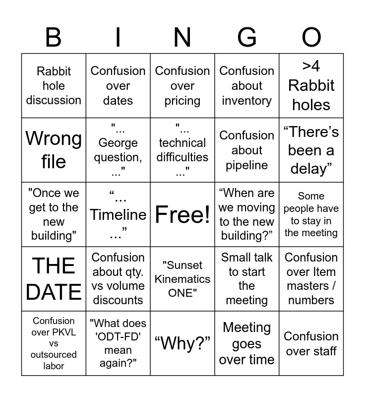 This bingo card has a free space and 58 words: "We'll talk about it offline", "What does 'ODT-FD' mean again?", Confusion over orders, THE DATE, Meeting goes over time, People not wanting Suntrack features, "... George question, ...", Someone talking while on mute, Confusion about pipeline, Confusion about reimbursing the customer for wind sensors, etc., Confusion about inventory, Confusion about wind sensors / ratio, Shannon confusion, Suntrack not working, “… Roadmap …”, Rabbit hole discussion, Confusion over staff, >4 Rabbit holes, PowerPoint Presentation not opening, "... technical difficulties ...", “When are we moving to the new building?”, Confusion over pricing, Confusion over PKVL vs outsourced labor, Confusion over Item masters / numbers, Customer disappointed with Suntrack, Some people have to stay in the meeting, Confusion about returns, Mention of a lost customer, “There’s been a delay”, "Switch site/customer <X> to Suntrack", "The ELT team decided ...", "...won't be joining us today, so I'm here", Complaining about MMB, “We haven’t decided on details”, Ops team confusion, Key person joining late, Engineering being questioned a lot, “... Timeline ...”, "Once we get to the new building", Complaining about MMB, Confusion about qty. vs volume discounts, Two people talking at the same time, Small talk to start the meeting, Meeting goes under time, “Add a new NPDI”, Ops team strangely not present, Merging Suntrack sales/discussions into a ONE meeting, "Sunset Kinematics ONE", “Why?”, Confusion over stock quantities, People having a private copy of THE FILE, "Can you see my screen?", Shannon asking a lot of questions, Wrong date, Confusion over dates, Someone important to the discussion is not present, Wrong file and Key person joining late.