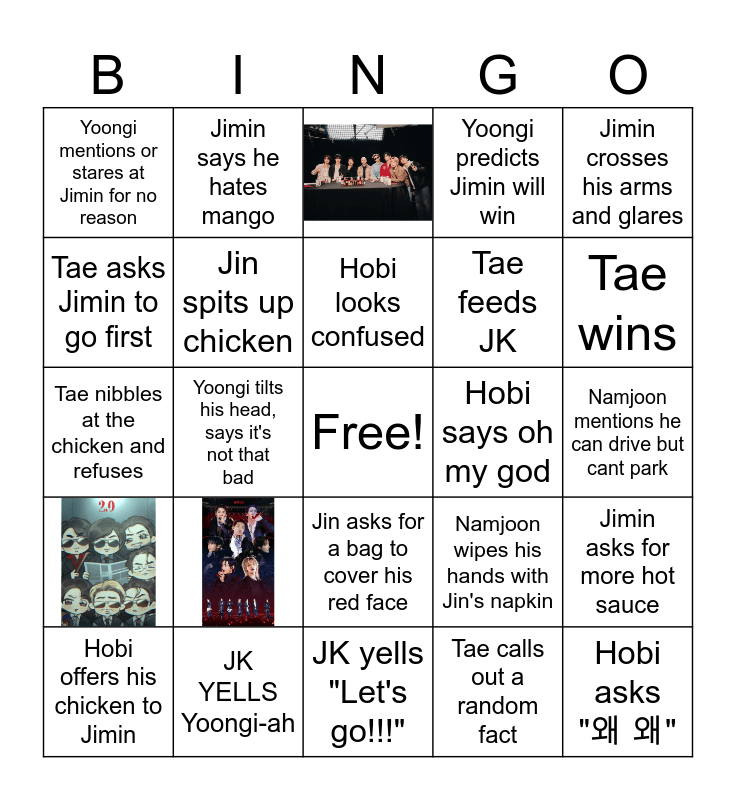 This bingo card has 4 images, a free space and 24 words: Namjoon spoils a concert song, JK YELLS Yoongi-ah, Hobi looks confused, Tae calls out a random fact, Jimin crosses his arms and glares, Yoongi mentions or stares at Jimin for no reason, Jin spits up chicken, JK yells "Let's go!!!", Hobi says oh my god, Jimin asks for more hot sauce, Tae nibbles at the chicken and refuses, Yoongi tilts his head, says it's not that bad, Namjoon wipes his hands with Jin's napkin, Hobi asks "왜 왜", Tae asks Jimin to go first, Namjoon asks for Eomma, Jin asks for a bag to cover his red face, Yoongi predicts Jimin will win, Tae wins, Hobi offers his chicken to Jimin, Jimin says he hates mango, JK asks for Eomma, Tae feeds JK and Namjoon mentions he can drive but cant park.