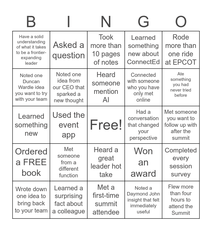 This bingo card has a free space and 24 words: Met someone from a different function, Learned a surprising fact about a colleague, Heard someone mention AI, Wrote down one idea to bring back to your team, Rode more than one ride at EPCOT, Have a solid understanding of what it takes to be a frontier-expanding leader, Noted one Duncan Wardle idea you want to try with your team, Asked a question, Had a conversation that changed your perspective, Heard a great leader hot take, Connected with someone who you have only met online, Learned something new, Won an award, Completed every session survey, Noted one idea from our CEO that sparked a new thought, Noted a Daymond John insight that felt immediately useful, Met someone you want to follow up with after the summit, Took more than 10 pages of notes, Ate something you had never tried before, Used the event app, Flew more than four hours to attend the Summit, Ordered a FREE book, Learned something new about ConnectEd and Met a first-time summit attendee.