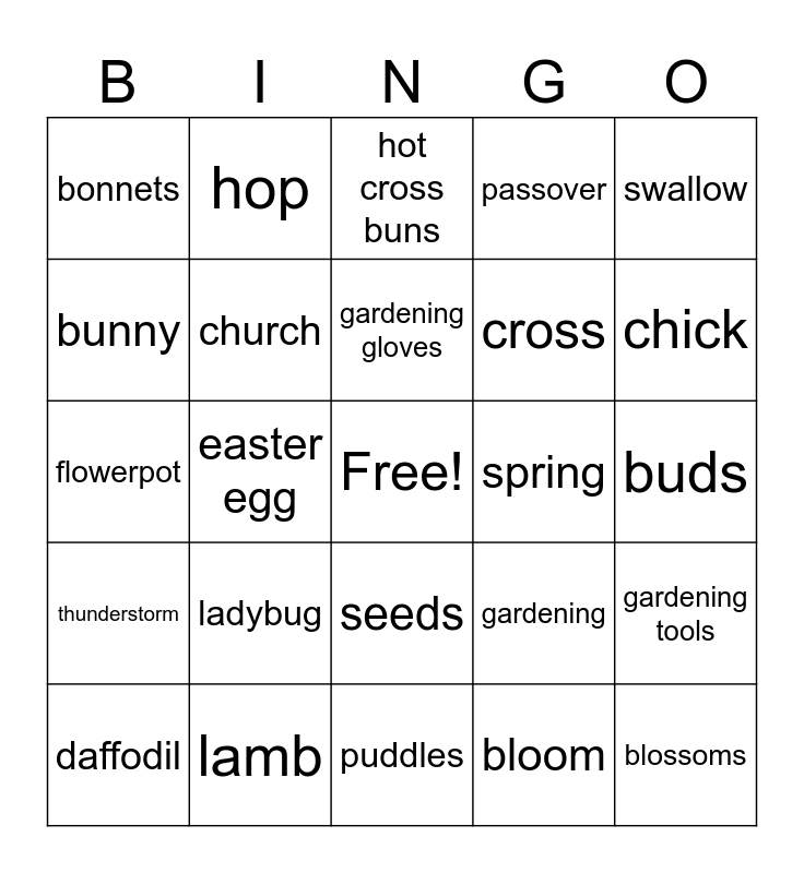 This bingo card has a free space and 29 words: daffodil, tulip, easter egg, basket, bonnets, hot cross buns, church, ladybug, spring, lamb, buds, blossoms, puddles, bloom, chick, mud, seeds, thunderstorm, swallow, flowerpot, gardening, nest, cross, bunny, passover, hop, gardening tools, gardening gloves and watering can.