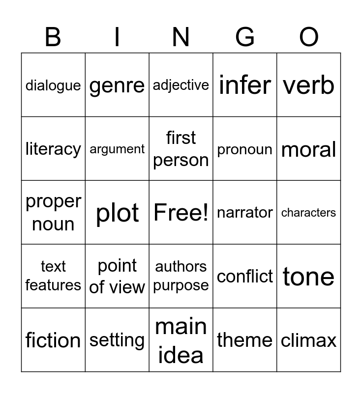 This bingo card has a free space and 29 words: fiction, nonfiction, plot, setting, dialogue, adjective, argument, point of view, narrator, setting, characters, climax, main idea, theme, moral, evidence, authors purpose, text features, verb, proper noun, conflict, solution, pronoun, literacy, infer, genre, tone, first person and foreshadowing.