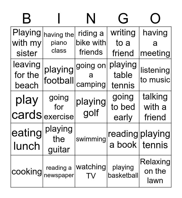 This bingo card has 29 words: cooking, playing volleyball, going for exercise, Relaxing on the lawn, Playing with my sister, riding a bike with friends, playing football, playing the guitar, going to bed early, reading a newspaper, talking with a friend, playing golf, watching TV, playing basketball, listening to music, working overtime, swimming, eating lunch, having a meeting, play cards, reading a book, swimming, playing table tennis, leaving for the beach, writing to a friend, having the piano class, playing tennis, going on a camping and growing some plants.