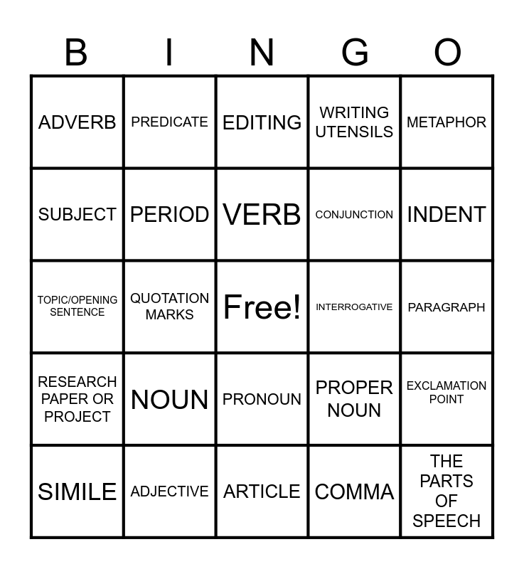 This bingo card has a free space and 24 words: NOUN, ADJECTIVE, VERB, SIMILE, METAPHOR, ADVERB, SUBJECT, PREDICATE, INTERROGATIVE, PRONOUN, CONJUNCTION, TOPIC/OPENING SENTENCE, PROPER NOUN, EXCLAMATION POINT, PERIOD, COMMA, PARAGRAPH, EDITING, INDENT, QUOTATION MARKS, THE PARTS OF SPEECH, RESEARCH PAPER OR PROJECT, WRITING UTENSILS and ARTICLE.