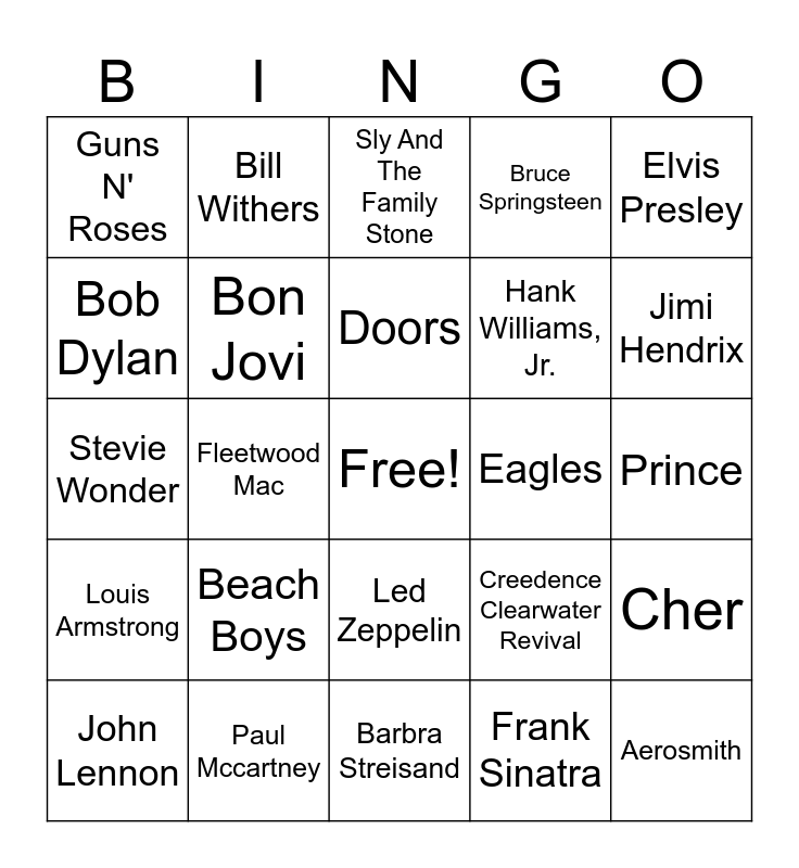 This bingo card has a free space and 46 words: AC/DC, Aerosmith, Aretha Franklin, Barbra Streisand, Beach Boys, Beatles, Bill Withers, Billy Joel, Bob Dylan, Bob Marley & The Wailers, Bon Jovi, Bruce Springsteen, Cher, Creedence Clearwater Revival, David Bowie, Diana Ross, Doors, Eagles, Elton John, Elvis Presley, Fleetwood Mac, Frank Sinatra, Guns N' Roses, Hank Williams, Jr., James Brown, Jimi Hendrix, John Lennon, Johnny Cash, Led Zeppelin, Louis Armstrong, Lynyrd Skynyrd, Madonna, Marvin Gaye, Metallica, Michael Jackson, Paul Mccartney, Prince, Queen, Ray Charles, Rolling Stones, Sam Cooke, Sly And The Family Stone, Stevie Wonder, Tom Petty, Whitney Houston and Willie Nelson.