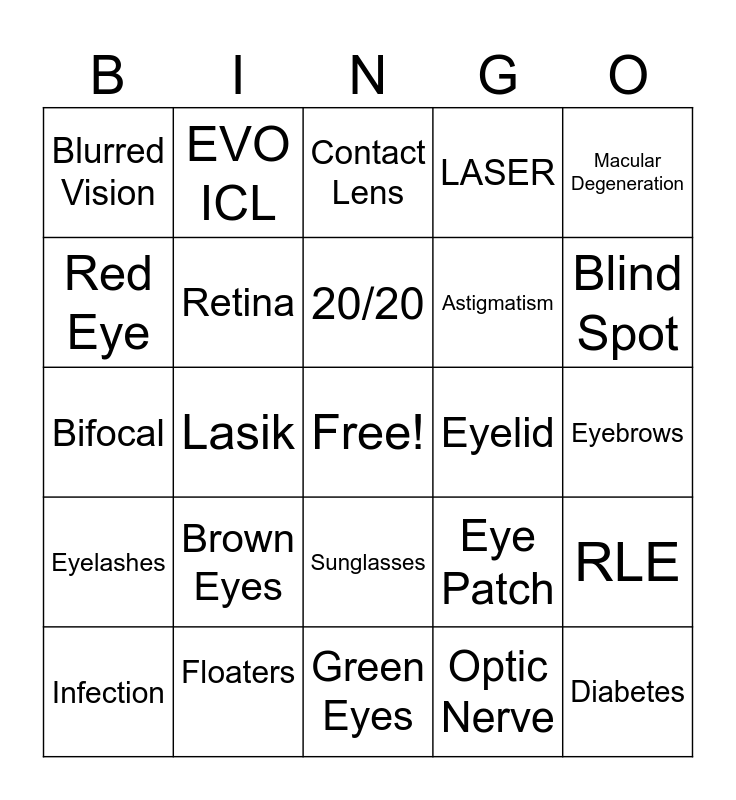 This bingo card has a free space and 29 words: Infection, Glaucoma, Lasik, Vision, Blurred Vision, Contact Lens, Retina, Brown Eyes, Eyelid, Floaters, Eyebrows, Diabetes, Green Eyes, Optic Nerve, Blind Spot, Iris, Sunglasses, Eyelashes, Macular Degeneration, Bifocal, Eye Patch, Pupil, Astigmatism, Red Eye, LASER, EVO ICL, RLE, 20/20 and 20/15.