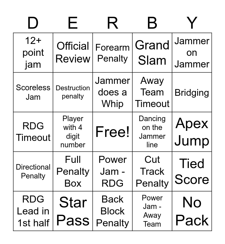 This bingo card has a free space and 26 words: Power Jam - RDG, Power Jam - Away Team, Jammer does a Whip, Star Pass, Jammer on Jammer, 12+ point jam, Scoreless Jam, Official Review, Apex Jump, Cut Track Penalty, Away Team Timeout, RDG Timeout, Tied Score, RDG Lead in 1st half, Player with 4 digit number, False Start, Grand Slam, Directional Penalty, Forearm Penalty, No Pack, Bridging, Back Block Penalty, Dancing on the Jammer line, Full Penalty Box, Destruction penalty and Incomplete star pass.