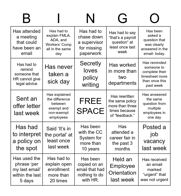 This bingo card has a free space and 24 words: Said ‘It’s in the portal’ at least once last week, Has had to explain open enrollment more than 20 times, Secretly loves policy writing, Has used the phrase ‘per my last email’ within the last 5 days, Has been asked a question that was clearly answered in the email- today., Has attended a meeting that could have been an email, Has had to remind someone that HR cannot give legal advice, Has had to explain FMLA, ADA, and Workers’ Comp all in the same day, Has rewritten the same policy more than three times because of “feedback.”, Has been with the CC System for more than 10 years, Has worked in more than two departments, Sent an offer letter last week, Has attended a career fair in the past 3 months, Posted a job vacancy last week, Has never taken a sick day, Held an Employee Orientation last week, Has answered the same question from multiple employees in one day, Has had to chase down a supervisor for missing paperwork, Has reminded someone to complete their timesheet more than once this past week, Has explained the difference between exempt and non-exempt employees, Has received an email marked “urgent” that was not urgent, Has had to interpret a policy on the spot, Has had to say “that’s a payroll question” at least once last week and Has been copied on an email that had nothing to do with HR..