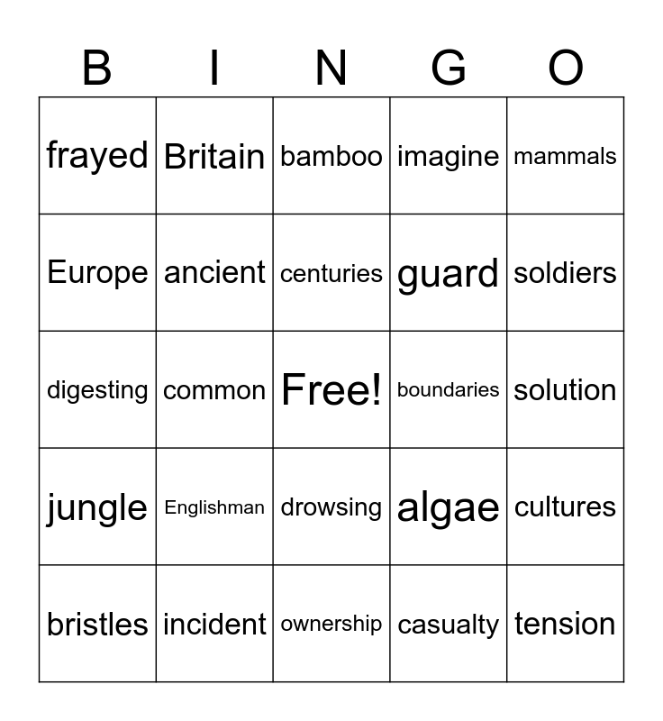 This bingo card has a free space and 29 words: bristles, essential, common, mass-produce, frayed, bamboo, ancient, Englishman, boundaries, incident, solution, tension, ownership, casualty, soldiers, British, drowsing, jungle, mammals, digesting, algae, energy, guard, Europe, imagine, Britain, cultures, centuries and burried.