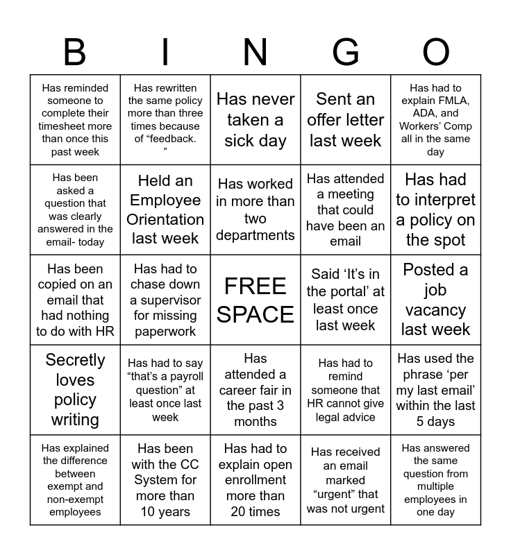 This bingo card has a free space and 24 words: Has had to say “that’s a payroll question” at least once last week, Has been with the CC System for more than 10 years, Has worked in more than two departments, Has explained the difference between exempt and non-exempt employees, Has had to explain FMLA, ADA, and Workers’ Comp all in the same day, Has reminded someone to complete their timesheet more than once this past week, Has been asked a question that was clearly answered in the email- today, Has rewritten the same policy more than three times because of “feedback. ”, Said ‘It’s in the portal’ at least once last week, Has attended a career fair in the past 3 months, Has attended a meeting that could have been an email, Has been copied on an email that had nothing to do with HR, Has had to remind someone that HR cannot give legal advice, Has used the phrase ‘per my last email’ within the last 5 days, Held an Employee Orientation last week, Has received an email marked “urgent” that was not urgent, Posted a job vacancy last week, Has never taken a sick day, Has had to interpret a policy on the spot, Has had to chase down a supervisor for missing paperwork, Has answered the same question from multiple employees in one day, Secretly loves policy writing, Sent an offer letter last week and Has had to explain open enrollment more than 20 times.