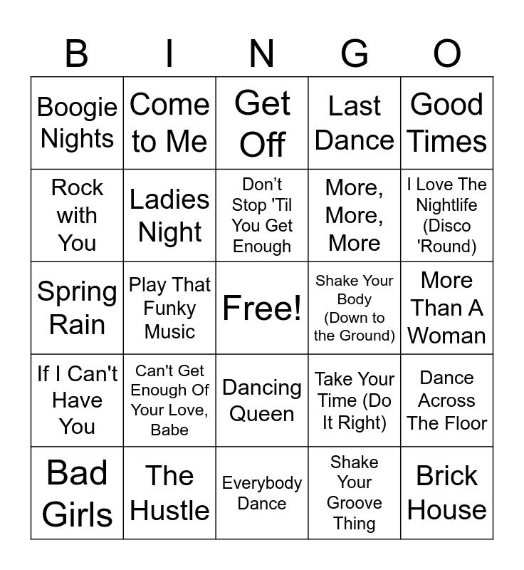 This bingo card has a free space and 39 words: Hot Stuff, Born to Be Alive, Let's Groove, Ladies Night, Bad Girls, Dancing Queen, Don’t Stop 'Til You Get Enough, Ring My Bell, Good Times, If I Can't Have You, Play That Funky Music, Last Dance, Brick House, More Than A Woman, Shake Your Body (Down to the Ground), Can't Get Enough Of Your Love, Babe, Macho Man, Boogie Nights, Boogie Oogie Oogie, Take Your Time (Do It Right), Rock with You, Everybody Dance, More, More, More, I Love The Nightlife (Disco 'Round), Rapper's Delight, Disco Nights (Rock Freak), Copacabana (At the Copa), Souvenirs, Let's All Chant, Come to Me, Keep On Dancin', Da Ya Think I'm Sexy?, Get Off, The Hustle, Shake Your Groove Thing, Working My Way Back to You / Forgive Me, Girl, Dance Across The Floor, Spring Rain and Move On Up.