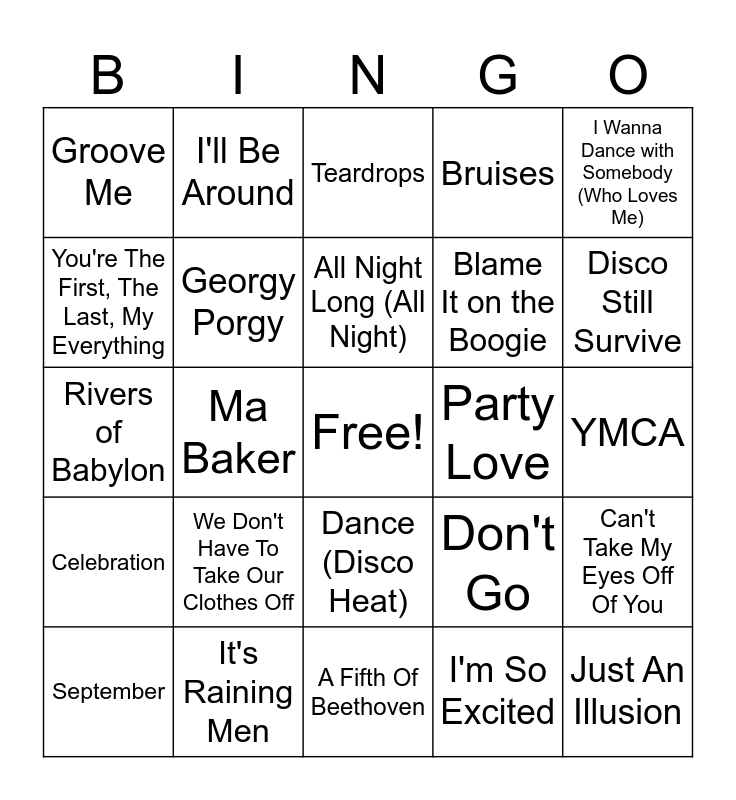 This bingo card has a free space and 58 words: Boogie Wonderland, It's Raining Men, Daddy Cool, Celebration, I'm So Excited, Funky Town, Georgy Porgy, Gimme! Gimme! Gimme! (A Man After Midnight), Blame It on the Boogie, Upside Down, Bruises, Never Can Say Goodbye, Pump Up The Jam, Ai No Corrida, Sexual Healing, Groove Me, Just An Illusion, I Wanna Dance with Somebody (Who Loves Me), Give It Up, All Night Long (All Night), Party Love, Teardrops, September, Can't Take My Eyes Off Of You, Disco Booty Party, YMCA, I Will Survive, Fresh, Disco Still Survive, Get Down Saturday Night, Fame, Give Me the Night, Disco Inferno, You Should Be Dancing, Stayin' Alive, Super Freak, Take Me Up, Ma Baker, Rivers of Babylon, How Will I Know, We Don't Have To Take Our Clothes Off, Raspberry Beret, Don't Go, Music Is My Way of Life, Dancin' the Night Away, I Can't Shake This Feeling, Dance Across The Floor, Dance (Disco Heat), A Fifth Of Beethoven, Disco Duck, Spacer, Doctor's Orders, Dancer, Dance Little Dreamer, I'll Be Around, Love Sensation, You're The First, The Last, My Everything and Walking In Rhythm.