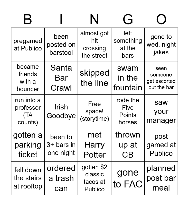 This bingo card has a free space and 24 words: been to 3+ bars in one night, ordered a trash can, skipped the line, fell down the stairs at rooftop, gone to wed. night jakes, pregamed at Publico, became friends with a bouncer, been posted on barstool, rode the Five Points horses, met Harry Potter, swam in the fountain, run into a professor (TA counts), thrown up at CB, post gamed at Publico, Santa Bar Crawl, gone to FAC, saw your manager, almost got hit crossing the street, seen someone get escorted out the bar, Irish Goodbye, planned post bar meal, gotten a parking ticket, left something at the bars and gotten $2 classic tacos at Publico.