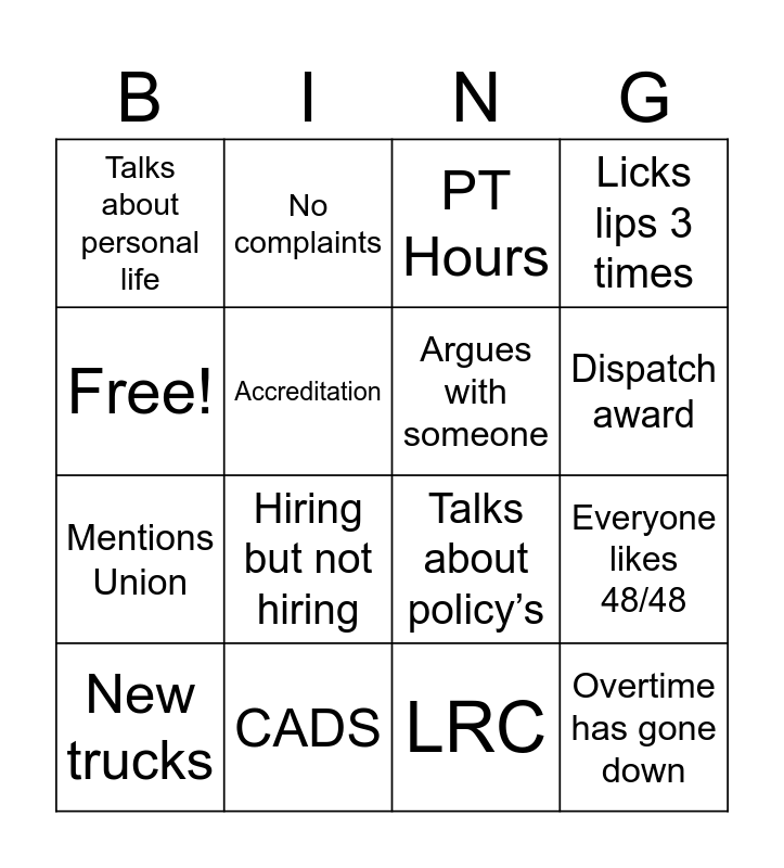 This bingo card has 16 words: CADS, Everyone likes 48/48, PT Hours, Talks about personal life, Mentions Union, No complaints, Talks about policy’s, LRC, Free!, Accreditation, New trucks, Licks lips 3 times, Hiring but not hiring, Dispatch award, Argues with someone and Overtime has gone down.