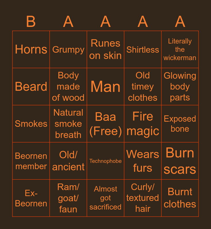 This bingo card has a free space and 24 words: Old/ ancient, Ram/ goat/ faun, Man, Ex-Beornen, Literally the wickerman, Horns, Beard, Grumpy, Fire magic, Technophobe, Old timey clothes, Smokes, Wears furs, Burn scars, Body made of wood, Curly/ textured hair, Exposed bone, Runes on skin, Glowing body parts, Natural smoke breath, Burnt clothes, Beornen member, Shirtless and Almost got sacrificed.