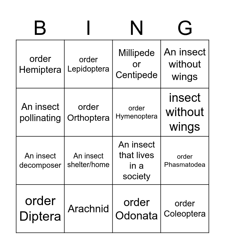This bingo card has 16 words: Arachnid, order Phasmatodea, Millipede or Centipede, order Hemiptera, An insect decomposer, order Lepidoptera, An insect that lives in a society, order Odonata, An insect pollinating, order Orthoptera, order Diptera, An insect without wings, An insect shelter/home, insect without wings, order Hymenoptera and order Coleoptera.