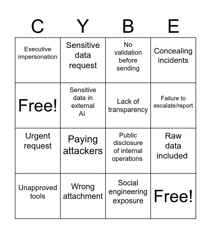 This bingo card has 16 words: Wrong attachment, Raw data included , No validation before sending, Executive impersonation , Urgent request , Sensitive data request, Public disclosure of internal operations , Social engineering exposure, Free!, Sensitive data in external AI , Unapproved tools, Concealing incidents, Paying attackers, Failure to escalate/report, Lack of transparency and Free!.
