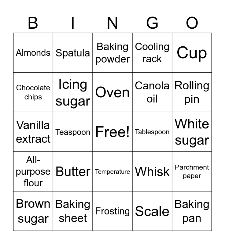 This bingo card has a free space and 32 words: Scale, Hand mixer, Teaspoon, Bowl, All-purpose flour, Icing sugar, Cup, Parchment paper, Spatula, Preheat, Oven, Baking powder, Eggs, Whipping cream, Tablespoon, Cocoa powder, Brown sugar, Vanilla extract, Temperature, Butter, Whisk, Baking soda, White sugar, Baking sheet, Baking pan, Cooling rack, Canola oil, Chocolate chips, Almonds, Frosting, Glaze and Rolling pin.