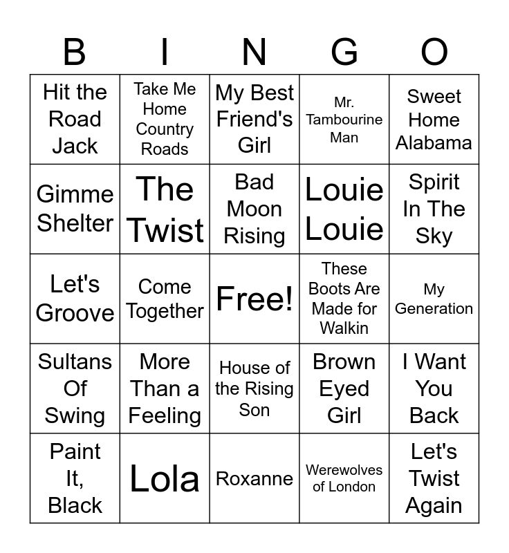 This bingo card has a free space and 39 words: Respect, You Really Got Me, Stayin Alive, The Twist, Paint It, Black, House of the Rising Son, Bad Moon Rising, Fortunate Son, Sweet Home Alabama, Sultans Of Swing, Come Together, Mr. Tambourine Man, Let's Twist Again, My Generation, These Boots Are Made for Walkin, More Than a Feeling, Layla, Hit the Road Jack, I'm a Believer, Brown Eyed Girl, Gimme Shelter, Roxanne, Louie Louie, Spirit In The Sky, Run Through The Jungle, Go Your Own Way, Night Moves, The Joker, Good Vibrations, Take Me Home Country Roads, I Heard it Through the Grapevine, Dream On, My Best Friend's Girl, Lola, Werewolves of London, Some Kind of Wonderful, I Want You Back, Let's Groove and Dancing Queen.