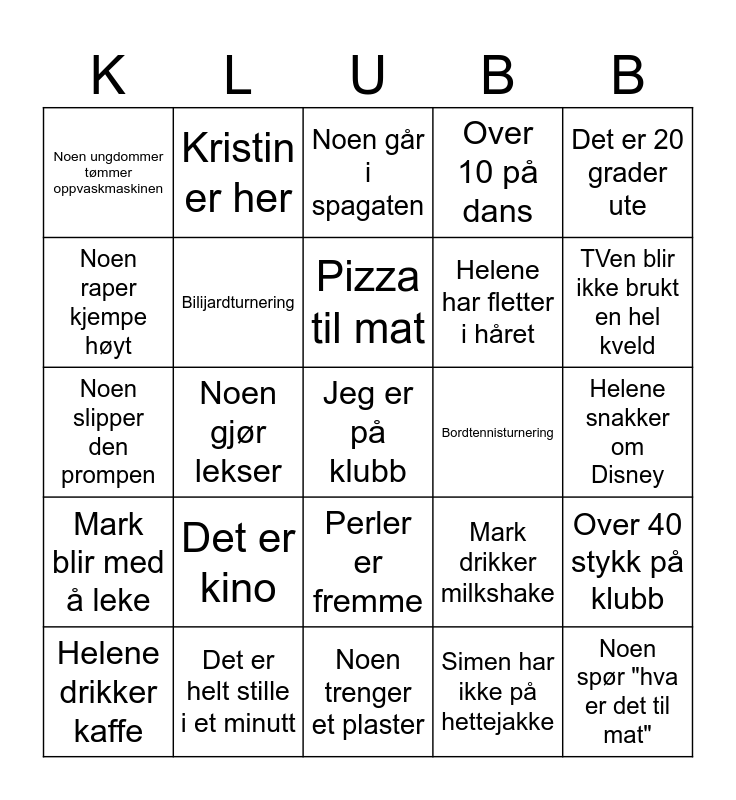 This bingo card has a free space and 27 words: Mark drikker milkshake, Noen vinner mere en 3 ganger på Bingo, Helene har fletter i håret, Noen trenger et plaster, Noen raper kjempe høyt, Noen går i spagaten, Kristin er her, Mark blir med å leke, Bordtennisturnering, Over 40 stykk på klubb, Noen slipper den prompen, Over 10 på dans, Helene drikker kaffe, Det er helt stille i et minutt, TVen blir ikke brukt en hel kveld, Noen spør om lader, Bilijardturnering, Pizza til mat, Det er kino, Noen ungdommer tømmer oppvaskmaskinen, Helene snakker om Disney, Simen har ikke på hettejakke, Noen gjør lekser, Noen spør "hva er det til mat", Perler er fremme, Det er 20 grader ute and Det regner.
