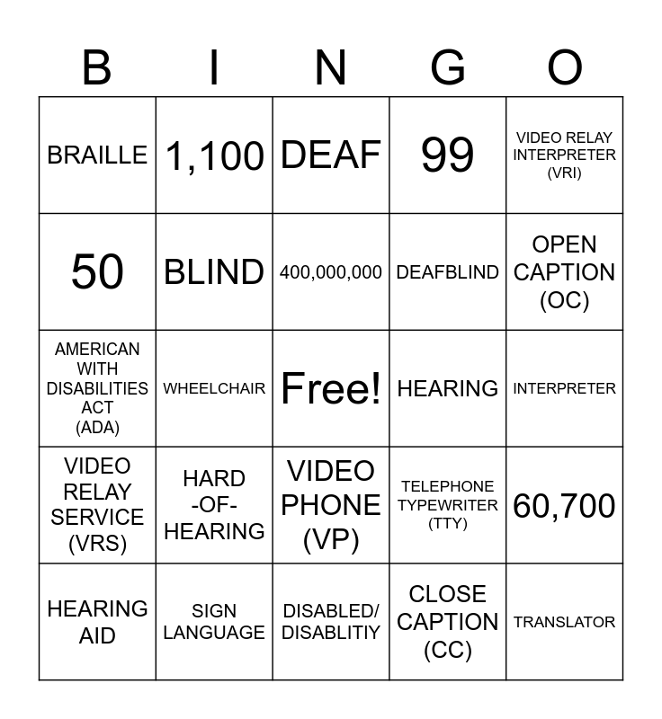 This bingo card has a free space and 29 words: HEARING AID, COCHLEAR IMPLANT, WHEELCHAIR, EYEGLASS, BRAILLE, DEAF, BLIND, HARD -OF-HEARING, HEARING, SIGN LANGUAGE, INTERPRETER, TRANSLATOR, DISABLED/ DISABLITIY, CLOSE CAPTION (CC), OPEN CAPTION (OC), SUBTITLES, VIDEO PHONE (VP), VIDEO RELAY SERVICE (VRS), VIDEO RELAY INTERPRETER (VRI), AMERICAN WITH DISABILITIES ACT (ADA), TELEPHONE TYPEWRITER (TTY), ACCESSIBLE, DEAFBLIND, 50, 99, 1,100, 60,700, 400,000,000 and 6,000,000,000.