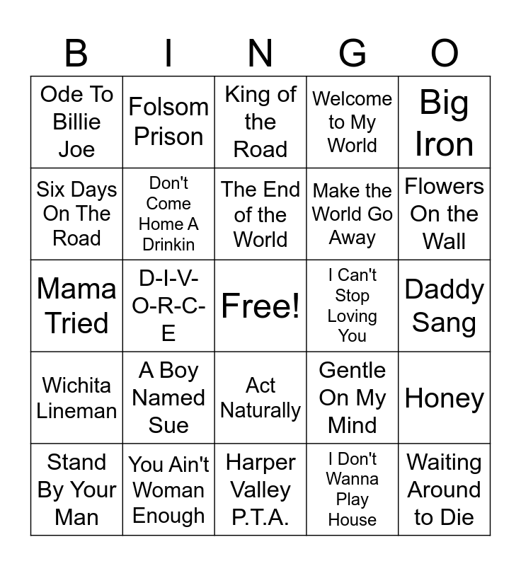 This bingo card has a free space and 34 words: I Fall to Pieces, I Don't Wanna Play House, Ring of Fire, Just Between You and Me, Wichita Lineman, Don't Come Home A Drinkin, Big Iron, Stand By Your Man, Folsom Prison, Right Or Wrong, The End of the World, King of the Road, Big Bad John, Jackson, I Can't Stop Loving You, Flowers On the Wall, You Ain't Woman Enough, Mama Tried, A Boy Named Sue, Gentle On My Mind, Act Naturally, Crazy, Ode To Billie Joe, Daddy Sang, Harper Valley P.T.A., Waiting Around to Die, Welcome to My World, Poetry in Motion, Make the World Go Away, Six Days On The Road, Dang Me, D-I-V-O-R-C-E, Honey and Galveston.