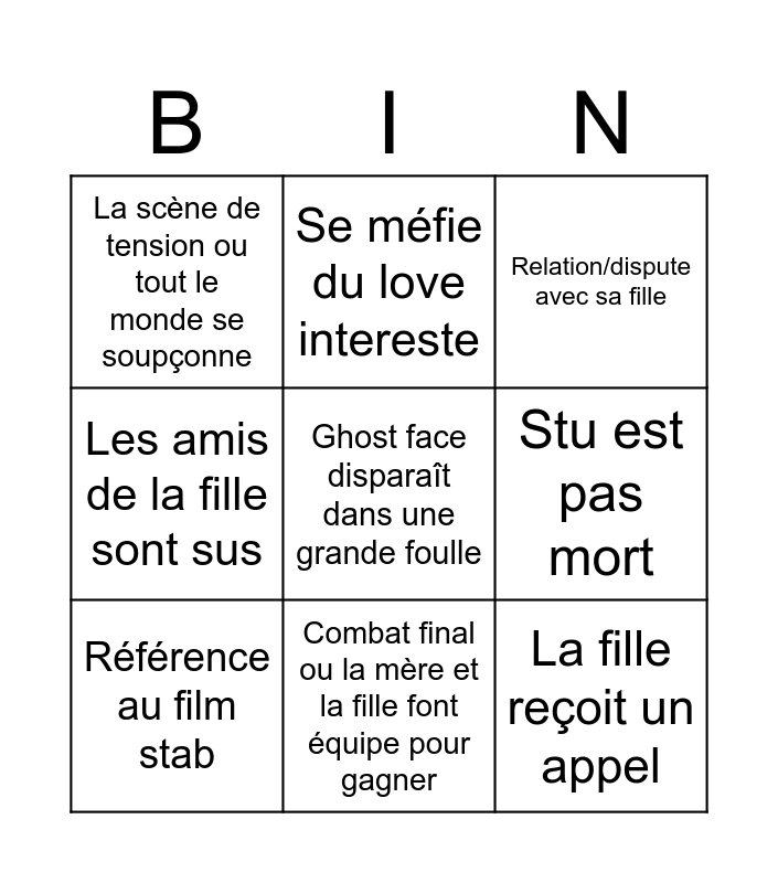 This bingo card has a free space and 8 words: Stu est pas mort, Relation/dispute avec sa fille, Se méfie du love intereste, Référence au film stab, La scène de tension ou tout le monde se soupçonne, La fille reçoit un appel, Les amis de la fille sont sus and Combat final ou la mère et la fille font équipe pour gagner.