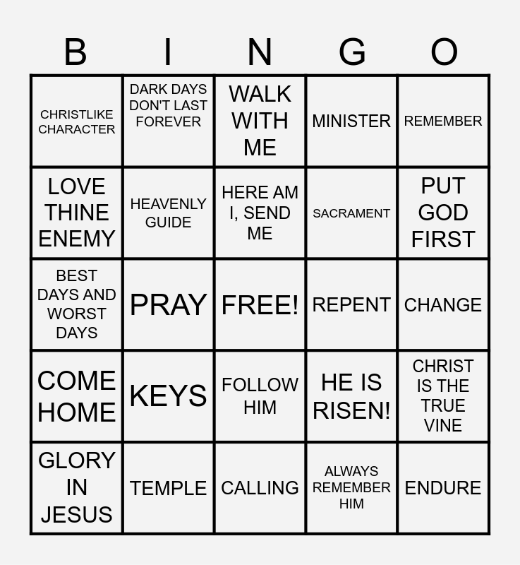 This bingo card has a free space and 24 words: KEYS, TEMPLE, HERE AM I, SEND ME, GLORY IN JESUS, REMEMBER, CHRISTLIKE CHARACTER, LOVE THINE ENEMY, DARK DAYS DON'T LAST FOREVER, REPENT, FOLLOW HIM, SACRAMENT, BEST DAYS AND WORST DAYS, HE IS RISEN!, CHRIST IS THE TRUE VINE, HEAVENLY GUIDE, ALWAYS REMEMBER HIM, CHANGE, WALK WITH ME, PUT GOD FIRST, PRAY, ENDURE, COME HOME, MINISTER and CALLING.