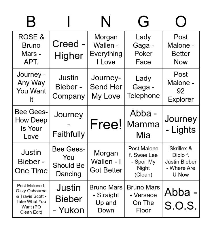 This bingo card has a free space and 75 words: Sexyy Red & Bruno Mars - Fat Juicy & (Clean), Lady Gaga - Electric Chapel, Journey- Send Her My Love, Justin Bieber - Daisies, Journey - Wheel In The Sky, Abba - Summer Night City, Morgan Wallen - Up Down, Lady Gaga - Teeth, Abba - Dancing Queen, Bruno Mars - That's What I Like, Lady Gaga - Highway Unicorn (Road To Love), The Kid LAROI & Justin Bieber - Stay, Morgan Wallen - I Got Better, Lady Gaga - Telephone, Journey - Ask The Lonely, Journey - Any Way You Want It, Justin Bieber - Yukon, Justin Bieber - Yummy, Post Malone - Over Now, Post Malone - 92 Explorer, Lady Gaga & Ariana Grande - Rain On Me, Creed - Higher, Bruno Mars - Straight Up and Down, Lady Gaga - Poker Face, Post Malone - Better Now, Creed - One Last Breath, Bee Gees - Jive Talkin', Bee Gees - More Than A Woman, Bee Gees - Stayin' Alive, Justin Bieber - Boyfriend, Bee Gees - Emotion, Lady Gaga - Perfect Illusion, Bruno Mars - Perm, Post Malone f. Swae Lee - Spoil My Night (Clean), Journey - Lights, ROSE & Bruno Mars - APT., Justin Bieber - What Do You Mean, Lady Gaga - Stupid Love, Abba - Mamma Mia, Abba - S.O.S., Abba - Waterloo, Post Malone - Wow, Mark Ronson f. Bruno Mars - Uptown Funk, Bruno Mars - I Just Might, Post Malone - White Iverson, Lady Gaga - Applause, Journey - Faithfully, Morgan Wallen - Everything I Love, Abba - Gimme! Gimme! Gimme!, Bruno Mars - 24k magic, Journey - Separate Ways (Worlds Apart), Justin Bieber - Company, Bee Gees - You Should Be Dancing, Abba - Fernando, Bruno Mars - Chunky, Abba - The Winner Takes It All, Creed - My Own Prison, Journey - Lovin' Touchin' Squeezin', Creed - My Sacrifice, Lady Gaga - Abracadabra, Post Malone f. Ozzy Osbourne & Travis Scott - Take What You Want (PO Clean Edit), Bruno Mars - Finesse, Abba - Super Trouper, Bee Gees- Bee Gees - Tragedy, Post Malone & Morgan Wallen - I Had Some Hel, Bee Gees- How Deep Is Your Love, Journey- Who's Crying Now, Abba- Take A Chance On Me, Journey - Only The Young, Skrillex & Diplo f. Justin Bieber - Where Are U Now, Justin Bieber - One Time, Bee Gees- You Should Be Dancing, Journey - Don't Stop Believin', Bruno Mars - Versace On The Floor and Journey - Open Arms.
