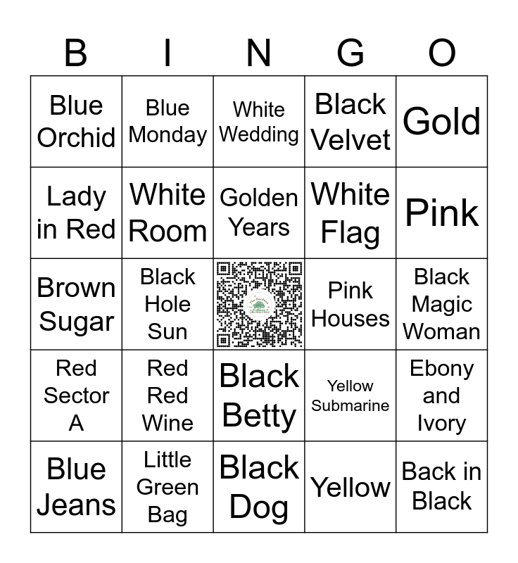 This bingo card has a free space and 50 words: Purple Rain, Back in Black, Paint It Black, Black Dog, Red Red Wine, Mr. Blue Sky, Blue Monday, Brown Eyed Girl, Lady in Red, Little Red Corvette, White Room, Black Velvet, Ebony and Ivory, Yellow Submarine, Green River, Blue Bayou, Golden Years, Pink Houses, Orange Crush, Gold, Black Hole Sun, Yellow, Blue Orchid, White Flag, Black Balloon, Grey Street, Pink, Gold Digger, White Wedding, Black Betty, Blue Eyes, Red Light Special, Black or White, Blue on Black, Little Green Bag, Red Rain, White Rabbit, Crimson and Clover, Green-Eyed Lady, Black Magic Woman, Yellow Ledbetter, Black Coffee in Bed, Red Barchetta, Silver Springs, Blue Jeans, Brown Sugar, Black Night, White Lines (Don’t Do It), Red Sector A and Pale Blue Eyes.