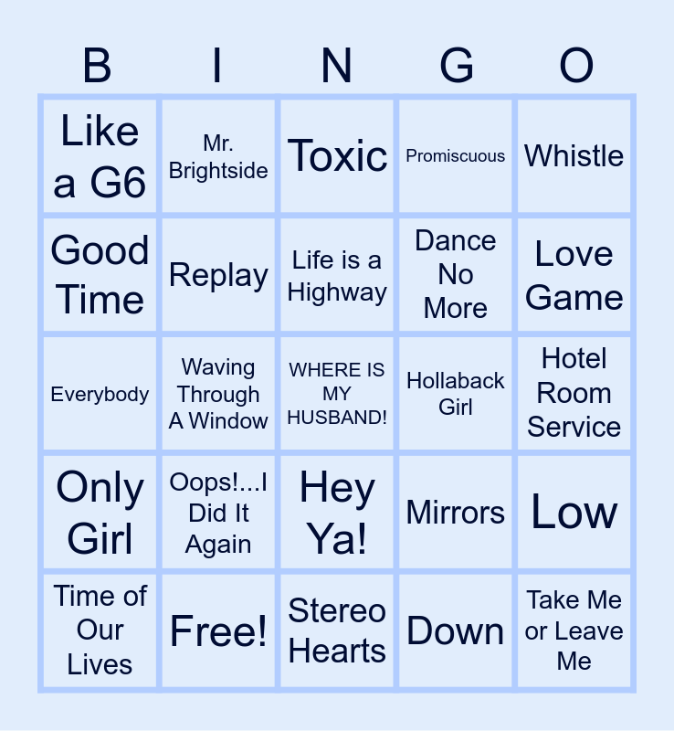 This bingo card has 58 words: DJ Got us fallin' in love Only Girl Down Club Can't Handle Me Replay Boom Boom Pow Dance No More Dancing Queen Promiscuous The Music of the Night Tik Tok S&M Dear Future Husband Like a G6 WHERE IS MY HUSBAND! Whistle Pocketful of Sunshine, Free!, DJ Got us fallin' in love, Only Girl, Down, Club Can't Handle Me, Replay, Boom Boom Pow, Dance No More, Dancing Queen, Promiscuous, The Music of the Night, Tik Tok, S&M, Dear Future Husband, Like a G6, WHERE IS MY HUSBAND!, Whistle, Pocketful of Sunshine, Life is a Highway, Hollaback Girl, Toxic, Time of Our Lives, Low, Pump It, Hotel Room Service, We Can't Stop, 4Minutes, Love Game, Ready or Not, What Makes You Beautiful, I Lived, Demons, Girlfriend, Glad you came, Taste, Me!, Waving Through A Window, Everybody, Take a Chance on Me, Oops!...I Did It Again, Take Me or Leave Me, Mirrors, Wildest Dreams, I want It That Way, Levitating, Best Song Ever, Hey Ya!, Stereo Hearts, My House, Want to Want Me, Somebody That I Used to Know, Cool Kids, She Looks so Perfect, Mr. Brightside, Cupid's Chokehold, Good Time and Yellow.