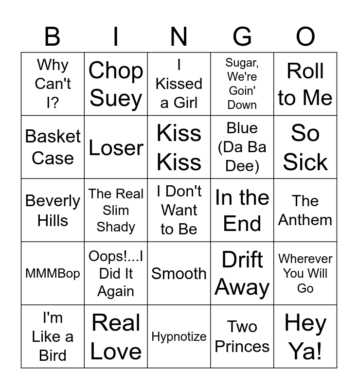 This bingo card has 38 words: Hand In My Pocket, Suga Suga, Larger Than Life, Loser, Wherever You Will Go, Oops!...I Did It Again, Kiss Kiss, Mr. Jones, Roll to Me, Blue (Da Ba Dee), The Real Slim Shady, Sugar, We're Goin' Down, I Don't Want to Be, The Anthem, Basket Case, MMMBop, Come Clean, I Kissed a Girl, Turn Me On, In the End, Why Can't I?, Real Love, So Sick, I'm Like a Bird, How You Remind Me, Hypnotize, Hey Ya!, Misery Business, Hey There Delilah, SOS, Boombastic, Smooth, Two Princes, Chop Suey, I Hate Everything About You, Drift Away, Beverly Hills and Ain't No Rest for the Wicked.