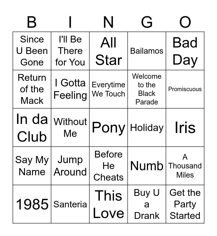 This bingo card has 39 words: Dear Maria, Count Me In, Barbie Girl, I Want It That Way, I Gotta Feeling, 1985, Before He Cheats, Everytime We Touch, One, Two Step, Bad Day, Say My Name, Without Me, Bailamos, Pony, Iris, Holiday, Jump Around, The Middle, Since U Been Gone, Jump, Numb, Return of the Mack, This Love, Welcome to the Black Parade, Promiscuous, Just a Girl, Pretty Fly (For a White Guy), Get the Party Started, Hotel Room Service, Sexy Can I, I'll Be There for You, Get Busy, Love Song, All Star, Santeria, Buy U a Drank, Waterfalls, A Thousand Miles, In da Club and Teenage Dirtbag.