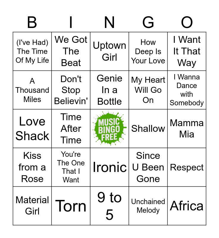 This bingo card has a free space and 41 words: We Are Family, Love Shack, Summer Nights, Don't Stop Believin', Torn, Ironic, Genie In a Bottle, No Scrubs, I Want It That Way, Kiss from a Rose, Time After Time, How Deep Is Your Love, Africa, Mamma Mia, Shallow, You're The One That I Want, Footloose, (I've Had) The Time Of My Life, Build Me Up Buttercup, Uptown Girl, Respect, Walking On Sunshine, 9 to 5, My Heart Will Go On, Endless Love, I Don't Want to Miss a Thing, Unchained Melody, Sweet Caroline, I Wanna Dance with Somebody, Girls Just Want to Have Fun, Man! I Feel Like A Woman!, We Got The Beat, Material Girl, Shake It Off, Since U Been Gone, A Thousand Miles, American Pie, Walking on Broken Glass, Suddenly I See, Stay (I Missed You) and Girls on Film.