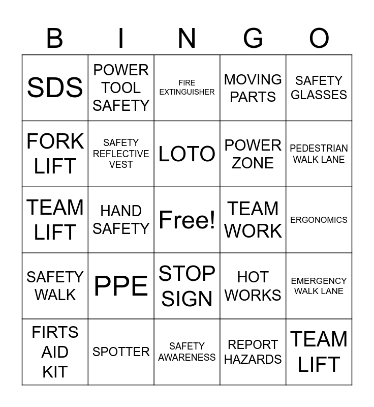 This bingo card has a free space and 24 words: PPE, SPOTTER, LOTO, FIRTS AID KIT, SAFETY GLASSES, SDS, FORK LIFT, POWER TOOL SAFETY, TEAM WORK, STOP SIGN, POWER ZONE, TEAM LIFT, HOT WORKS, EMERGENCY WALK LANE, SAFETY REFLECTIVE VEST, REPORT HAZARDS, ERGONOMICS, FIRE EXTINGUISHER, PEDESTRIAN WALK LANE, HAND SAFETY, TEAM LIFT, SAFETY WALK, MOVING PARTS and SAFETY AWARENESS.
