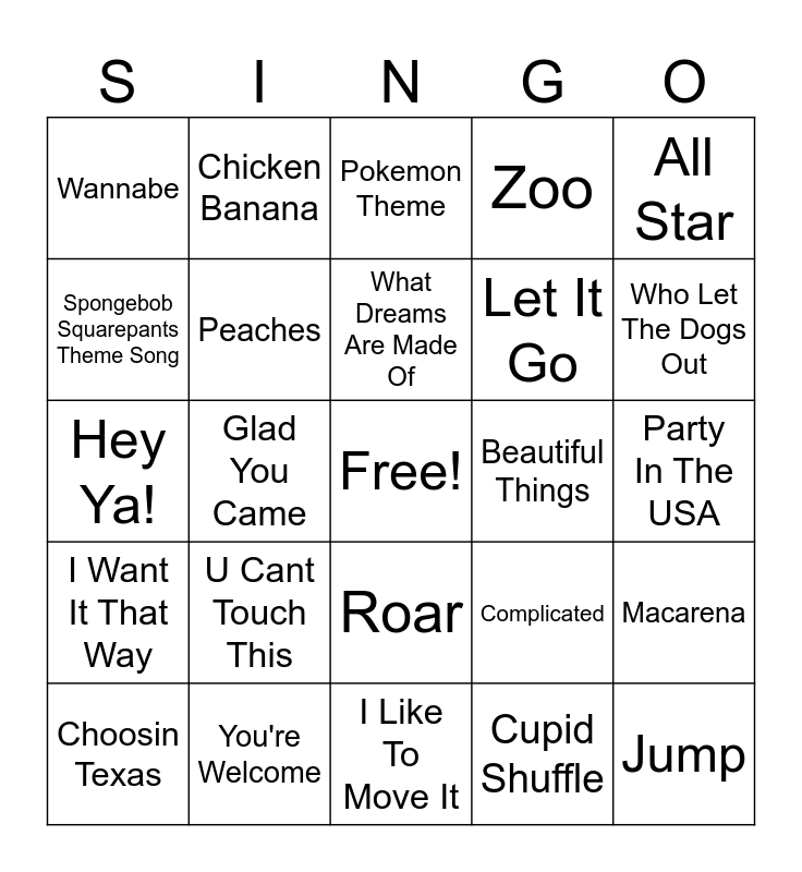This bingo card has a free space and 71 words: I'm a Gummy Bear, Chicken Banana, Golden, Soda Pop, I Like To Move It, Lemonade, Zoo, Baby Shark, Let It Go, Bye Bye Bye, Choosin Texas, The Fate of Ophelia, Who Let The Dogs Out, Wannabe, Better When I'm Dancin, Hey Ya!, Complicated, All Star, Drops Of Jupiter, Party In The USA, U Cant Touch This, Jump, Macarena, This Is How We Do It, Yeah!, Low, Ice Ice Baby, Always Be My Baby, The Fresh Prince of Bel Air, We Don't Talk About Bruno, You're Welcome, Levitating, Uptown Funk, Cha Cha Slide, Cupid Shuffle, Cotton Eyed Joe, Flowers, As It Was, Spongebob Squarepants Theme Song, Timber, Roar, Happy, I Want It That Way, Barbie Girl, Y.M.C.A., I Wanna Dance With Somebody, Star Wars Theme Song, Peaches, Shake It Off, Bidi Bidi Bom Bom, Como La Flor, Texas Hold Em, Beautiful Things, Un Poco Loco, Life is a Highway, The Best of Both Worlds, What Dreams Are Made Of, Defying Gravity, Popular, Cheerleader, Thank You, Brown Skin Girl, Glad You Came, Chanel, Surface Pressure, Raining Tacos, Pokemon Theme, Bluey Theme, Super Mario Theme, Paw Patrol Theme and Hakuna Matata.
