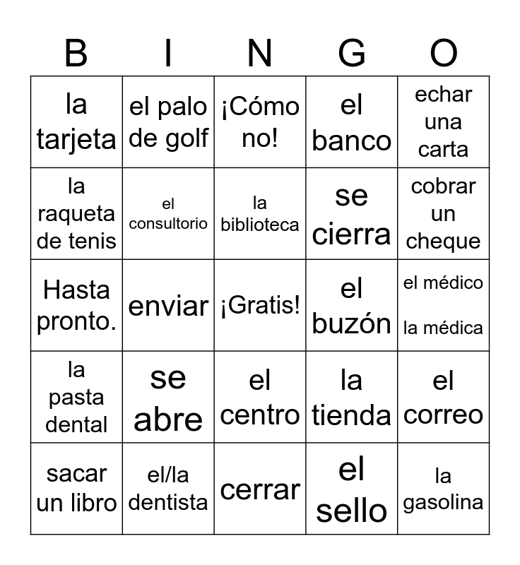 This bingo card has a free space and 46 words: los patines, la gasolina, llenar el tanque, cerrar, se abre, ir a pie, el palo de golf, la pelota, la raqueta de tenis, el equipo deportivo, el consultorio, el banco, el correo, la tienda, la farmacia, el supermercado, la biblioteca, el buzón, la carta, echar una carta, enviar, el sello, la tarjeta, se cierra, el jabón, cobrar un cheque, sacar un libro, devolver un libro, el centro, la pasta dental, el champú, la estación de servicio, el cepillo de dientes, se me olvidó, cuidar a, el/la dentista, el médico la médica, casi, caramba, hasta, por, ¡Cómo no!, Hasta pronto., quedarse, todavía and varios,as.