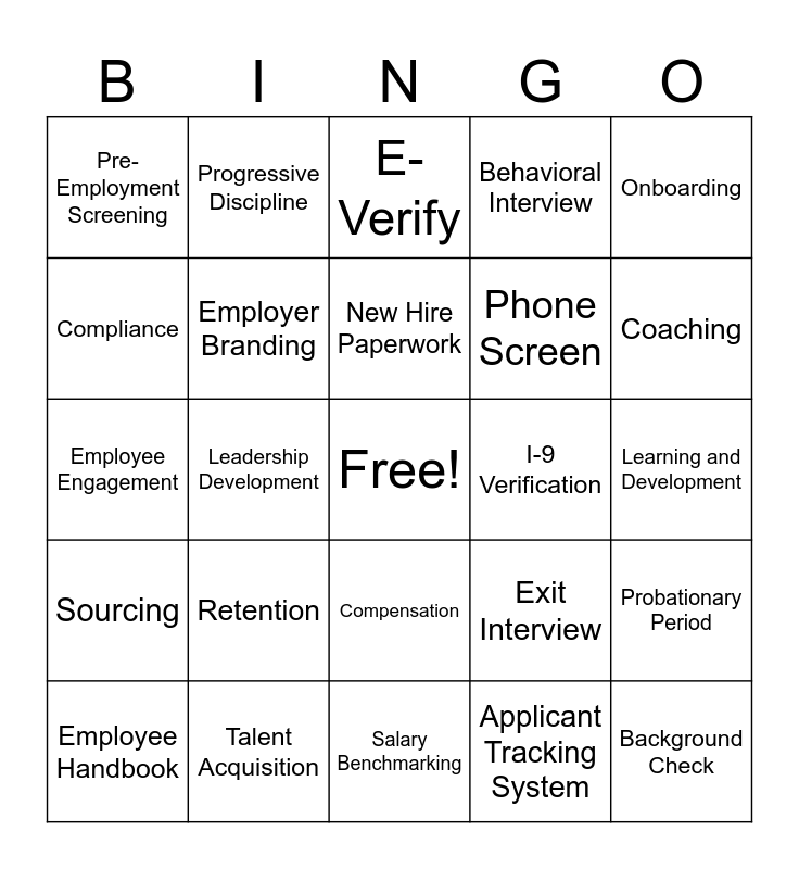 This bingo card has a free space and 58 words: Workforce Planning, Talent Acquisition, Recruiting, Sourcing, Applicant Tracking System, Job Posting, Employer Branding, Resume Screening, Phone Screen, Interviewing, Behavioral Interview, Panel Interview, Selection, Job Offer, Offer Letter, Pre-Employment Screening, Background Check, Onboarding, Orientation, New Hire Paperwork, I-9 Verification, E-Verify, Employee Handbook, Probationary Period, Training, Learning and Development, Upskilling, Mentorship, Coaching, Performance Management, Performance Review, Goal Setting, SMART Goals, Continuous Feedback, Employee Development, Career Pathing, Succession Planning, Leadership Development, Employee Engagement, Employee Experience, Retention, Turnover, Exit Interview, Offboarding, Workforce Analytics, HR Metrics, Total Rewards, Compensation, Salary Benchmarking, Pay Equity, Benefits, Open Enrollment, Employee Relations, Conflict Resolution, Progressive Discipline, Corrective Action, Compliance and Workplace Policy.