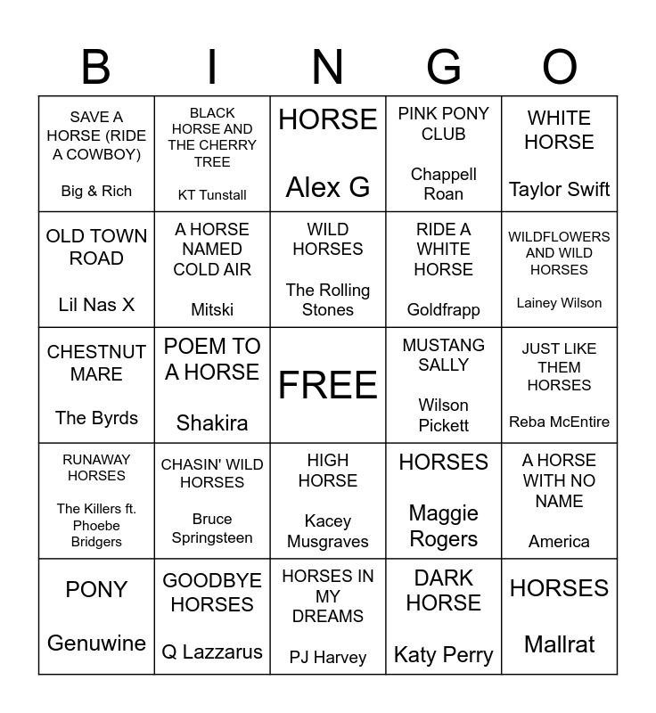 This bingo card has a free space and 26 words: HIGH HORSE Kacey Musgraves, DARK HORSE Katy Perry, WILD HORSES The Rolling Stones, GOODBYE HORSES Q Lazzarus, WHITE HORSE Taylor Swift, SAVE A HORSE (RIDE A COWBOY) Big & Rich, OLD TOWN ROAD Lil Nas X, BLACK HORSE AND THE CHERRY TREE KT Tunstall, JUST LIKE THEM HORSES Reba McEntire, HORSES Maggie Rogers, RIDE A WHITE HORSE Goldfrapp, CHESTNUT MARE The Byrds, A HORSE WITH NO NAME America, PONY Genuwine, POEM TO A HORSE Shakira, PONYBOY SOPHIE, PINK PONY CLUB Chappell Roan, RUNAWAY HORSES The Killers ft. Phoebe Bridgers, HORSE Alex G, HORSES Mallrat, WILDFLOWERS AND WILD HORSES Lainey Wilson, HORSES IN MY DREAMS PJ Harvey, MUSTANG SALLY Wilson Pickett, CHASIN' WILD HORSES Bruce Springsteen, A HORSE NAMED COLD AIR Mitski and THE UNICORN The Irish Rovers.