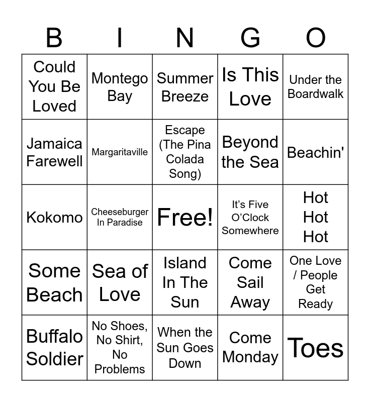 This bingo card has a free space and 40 words: Three Little Birds, Kokomo, Banana Boat (Day-O), Margaritaville, No Shoes, No Shirt, No Problems, Island In The Sun, Escape (The Pina Colada Song), Red Red Wine, Under the Boardwalk, Some Beach, Cheeseburger In Paradise, Is This Love, Toes, Hot Hot Hot, It’s Five O’Clock Somewhere, Sea of Love, Volcano, Could You Be Loved, No Woman No Cry, Summer Breeze, One Love / People Get Ready, Come Monday, Beyond the Sea, Jamaica Farewell, Chattahoochee, Brandy (You’re a Fine Girl), Son Of A Son Of A Sailor, Island Song, Stir It Up, Good Vibrations, Changes In Latitudes, Changes In Attitudes, Buffalo Soldier, Southern Cross, Come Sail Away, Beachin', When the Sun Goes Down, California Girls, Pontoon, Montego Bay and Boat Drinks.