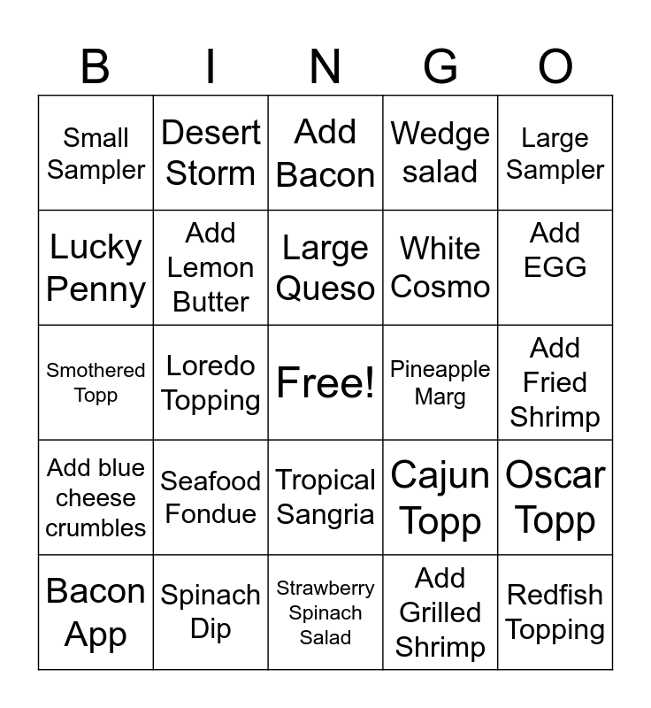 This bingo card has a free space and 24 words: Seafood Fondue, Spinach Dip, Large Queso, Bacon App, Large Sampler, Small Sampler, Lucky Penny, Desert Storm, Pineapple Marg, Tropical Sangria, White Cosmo, Smothered Topp, Cajun Topp, Oscar Topp, Add Lemon Butter, Add Grilled Shrimp, Add Fried Shrimp, Add Bacon, Add EGG, Loredo Topping, Redfish Topping, Add blue cheese crumbles, Wedge salad and Strawberry Spinach Salad.