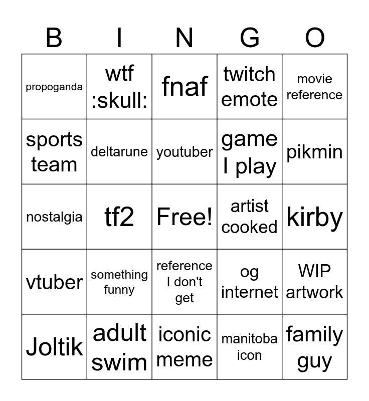 This bingo card has a free space and 24 words: something funny, adult swim, youtuber, Joltik, movie reference, propoganda, sports team, wtf :skull:, artist cooked, reference I don't get, game I play, nostalgia, og internet, WIP artwork, deltarune, manitoba icon, kirby, fnaf, pikmin, tf2, family guy, vtuber, twitch emote and iconic meme.