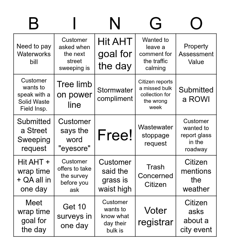 This bingo card has a free space and 30 words: Handle a call under 3 minutes, Get 10 surveys in one day, Hit AHT goal for the day, Perfect QA Score, Property Assessment Value, Need to pay Waterworks bill, Tree limb on power line, Stormwater compliment, Citizen reports a missed bulk collection for the wrong week, Citizen asks about a city event, Meet wrap time goal for the day, Customer offers to take the survey before you ask, Voter registrar, Receive a customer compliment/praise while on the phone, Hit AHT + wrap time + QA all in one day, Customer asked what the Stormwater fee is, Customer wants to know what day their bulk is, Wastewater stoppage request, Citizen mentions the weather, Customer wants to speak with a Solid Waste Field Insp., Customer says the word "eyesore", Submitted an Eng - Project Info request, Wanted to leave a comment for the traffic calming, Customer wanted to report glass in the roadway, Submitted a Street Sweeping request, Customer asked when the next street sweeping is, Customer said the grass is waist high, Trash Concerned Citizen, Submitted a ROWI and Submitted a PM complaint.