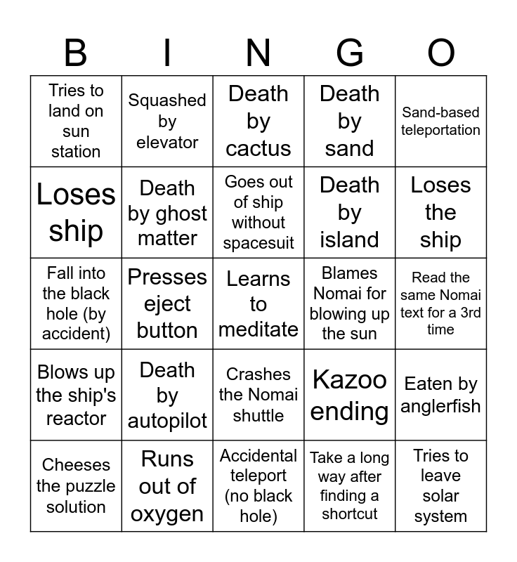 This bingo card has 25 words: Death by autopilot, Accidental teleport (no black hole), Goes out of ship without spacesuit, Cheeses the puzzle solution, Sand-based teleportation, Tries to land on sun station, Loses ship, Squashed by elevator, Blames Nomai for blowing up the sun, Crashes the Nomai shuttle, Death by island, Fall into the black hole (by accident), Kazoo ending, Eaten by anglerfish, Death by ghost matter, Tries to leave solar system, Read the same Nomai text for a 3rd time, Death by cactus, Loses the ship, Presses eject button, Learns to meditate, Runs out of oxygen, Blows up the ship's reactor, Death by sand and Take a long way after finding a shortcut.