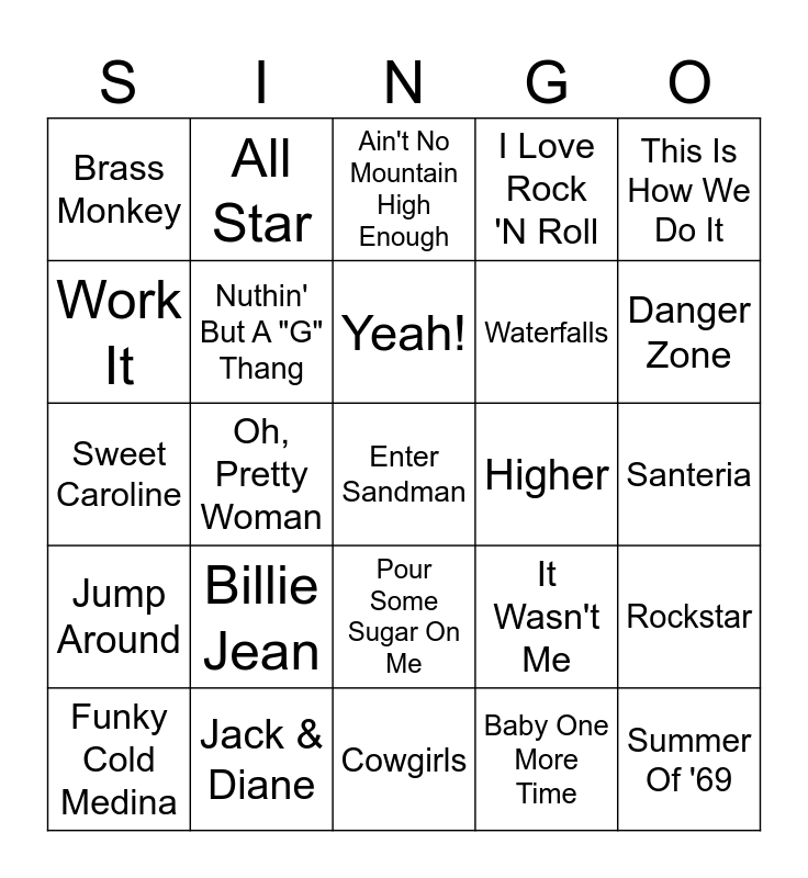 This bingo card has 152 words: Who Am I (What's My Name?), She Will Be Loved, It Wasn't Me, Temperature, Drop It Like It's Hot, Summer Love, Big Poppa, Jump, Let's Get Married, All The Small Things, I Want You Back - *NSYNC, Pretty Fly (For A White Guy), Waterfalls, My Boo, Santeria, This Is How We Do It, Wannabe, California Love, Mambo No. 5, Smells Like Teen Spirit, Every Morning, Iris, Party Up (Up In Here), Gangsta's Paradise, One Week, Wonderwall, Baby One More Time, Jump Around, Closing Time, Tubthumping, Ironic, Only Wanna Be With You, Return of the Mack, All Star, Say My Name, Livin'la Vida Loca, Everybody (Backstreet's Back), No Scrubs, What's Up?, Poison, Go DJ, U Can't Touch This, Enter Sandman, Hip Hop Hooray, Smooth, (You Drive Me) Crazy, Larger Than Life, I Want It That Way, Higher, Country Grammar, Ants Marching, Edge of Seventeen, Pour Some Sugar On Me, Your Love, Don't Stop Believin', Danger Zone, Welcome To The Jungle, Rebel Yell, Paradise City, Livin' On A Prayer, Walk This Way, Uptown Girl, Summer Of '69, Rock You Like A Hurricane, I'm Gonna Be (500 Miles), Billie Jean, I Wanna Dance with Somebody, Baby, I Love Your Way, Could You Be Loved, Heartless, Ice Ice Baby, Tom Sawyer, So Fresh, So Clean, Cowgirls, Lil Bit, A Bar Song (Tipsy), Choosin' Texas, In Da Club, My Name Is, Bye Bye Bye, Never Gonna Give You Up, Dancing Queen, Rollin', Nuthin' But A "G" Thang, Sweet Caroline, Low, Whoomp! There it is!, Funky Cold Medina, Brass Monkey, NOKIA, Oh, Pretty Woman, September, Piano Man, Rich Girl, Play That Funky Music, More Than a Feeling, Don't Stop 'Til You Get Enough, Barracuda, Stayin Alive, Runaround Sue, Crank That (Soulja Boy), Ms. Jackson, Hey Ya!, Rock Your Body, Yeah!, Don't Stop The Music, I Had Some Help, SexyBack, Party In The U.S.A., Turn Down for What, Fireball, Ain't No Mountain High Enough, Rockstar, Tipsy, A Thousand Miles, Hollaback Girl, Angel, Work It, Unwritten, Firework, Girls Just Want to Have Fun, Uptown Funk, Stand By Me, My Girl, Come Together, Shout, I Can't Help Myself (Sugar Pie, Honey Bunch), I Got You (I Feel Good), Green Onions, Surfin' Bird, What You Won't Do for Love, Baba O'Riley, Low Rider, Renegade, Sherry, The Stroke, Mony Mony, Jack & Diane, Sharp Dressed Man, I Love Rock 'N Roll, Crazy Train, Bringin' On The Heartbreak, The Joker, Hit Me With Your Best Shot, Cold as Ice, Last Night, Start Me Up, 24K Magic, Party Like A Rockstar, Careless Whisper, I Want You Back - Jackson 5 and Be My Baby.