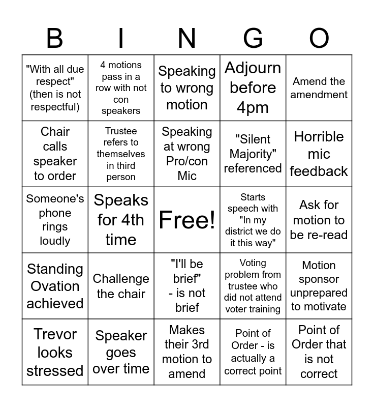 This bingo card has a free space and 24 words: Challenge the chair, Speaker goes over time, Speaking at wrong Pro/con Mic, Trevor looks stressed, Amend the amendment, "With all due respect" (then is not respectful), Chair calls speaker to order, 4 motions pass in a row with not con speakers, Starts speech with "In my district we do it this way", "I'll be brief" - is not brief, "Silent Majority" referenced, Someone's phone rings loudly, Voting problem from trustee who did not attend voter training, Motion sponsor unprepared to motivate, Trustee refers to themselves in third person, Point of Order - is actually a correct point, Ask for motion to be re-read, Speaking to wrong motion, Horrible mic feedback, Speaks for 4th time, Point of Order that is not correct, Standing Ovation achieved, Adjourn before 4pm and Makes their 3rd motion to amend.