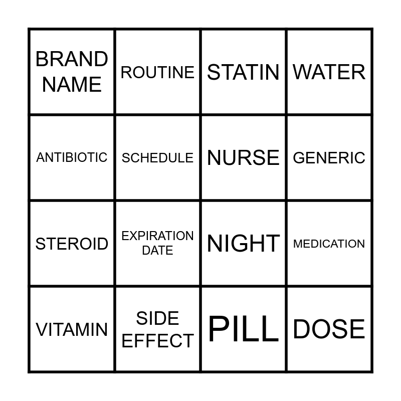 This bingo card has 16 words: SIDE EFFECT, MEDICATION, STATIN, BRAND NAME, STEROID, ROUTINE, NIGHT, PILL, ANTIBIOTIC, SCHEDULE, VITAMIN, WATER, EXPIRATION DATE, GENERIC, NURSE and DOSE.