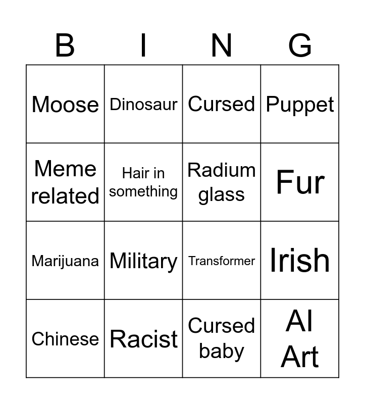 This bingo card has 16 words: Racist, Irish, Cursed, Moose, Marijuana, Dinosaur, Transformer, Cursed baby, Meme related, Hair in something, Chinese, Puppet, Military, Fur, Radium glass and AI Art.